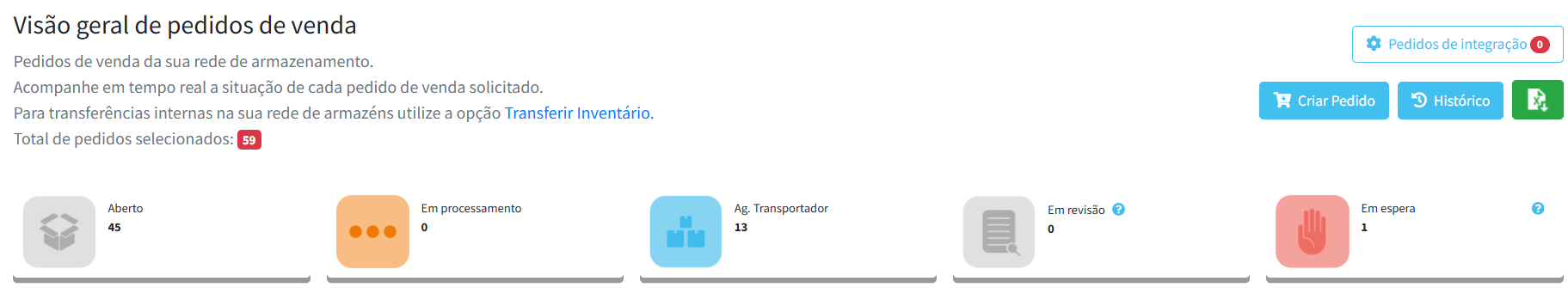Ao acessar a aba de Pedidos de Venda no portal do cliente (WMS), você verá que cada pedido possui um status com uma cor específica. Esses status indicam em que etapa do processo logístico o pedido se encontra.