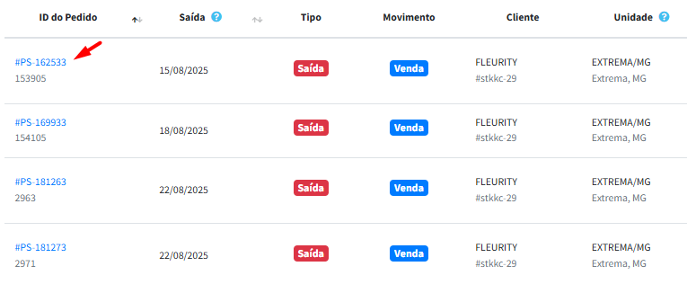 Localize o pedido e clique no botão PS (em azul, à esquerda da tela).